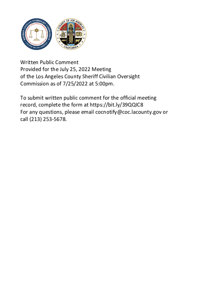 Written Public Comment Provided for the July 25, 2022, Meeting of the Los Angeles County Sheriff Civilian Oversight Commission as of 7/25/2022 at 5:00pm. To submit written public comment for the official