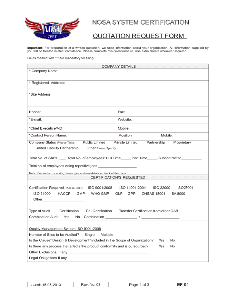 Nosa System Certification Quotation is not the form you're looking for?Search for another form here.