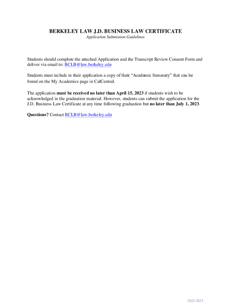 BERKELEY LAW J.D. BUSINESS LAW CERTIFICATE Application Submission GuidelinesStudents should complete the attached Application and the Transcript Review Consent Form and deliver via email to: BCLB@law.berkeley.edu