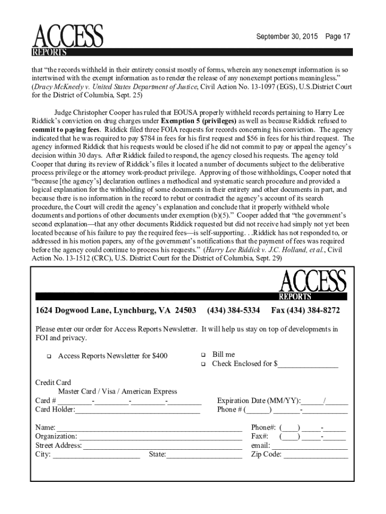 Volume 41, Number 19 September 30, 2015A Journal of News & Developments, Opinion & Analysis In this Issue Court Finds Requests Fall Victim To Failure to Exhaust Remedies ............. 1 Views from