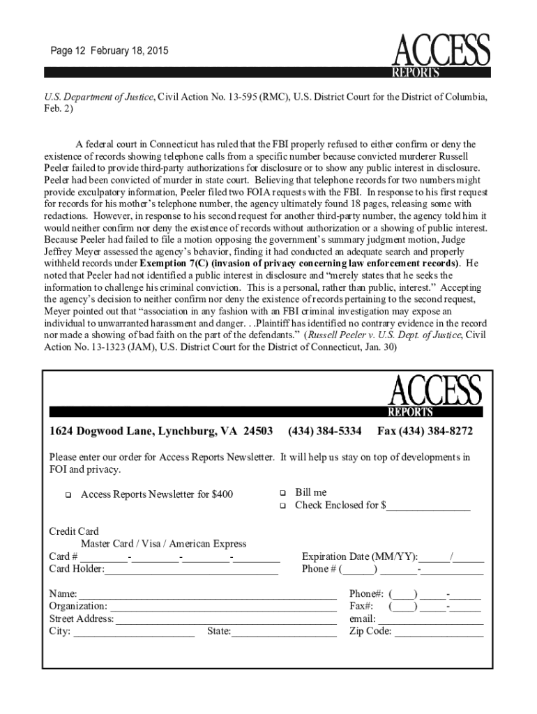 Volume 41, Number 4 February 18, 2015A Journal of News & Developments, Opinion & Analysis In this Issue D.C. Circuit Affirms Exemption 7(F)s Broad Coverage ................. 1 Views from the States