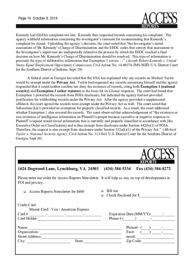 Volume 40, Number 20 October 8, 2014A Journal of News & Developments, Opinion & Analysis In this Issue Court Finds Database Redaction Too Burdensome................ 1 Views from the States ...........................