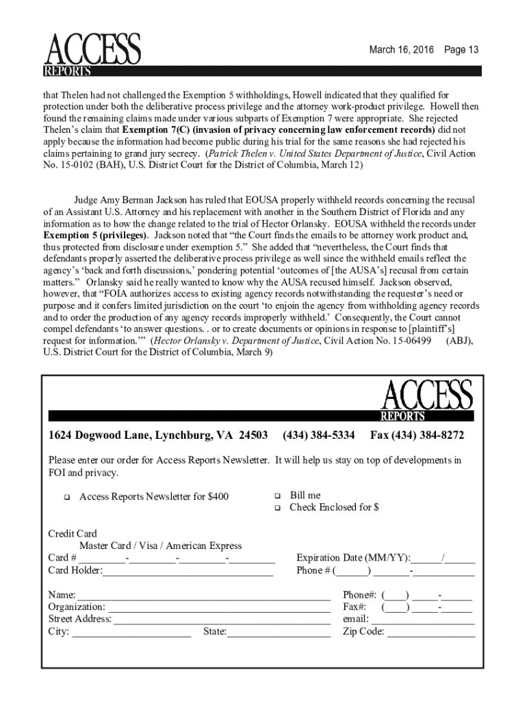Volume 42, Number 6 March 16, 2016A Journal of News & Developments, Opinion & Analysis In this Issue Court Finds FOIA Provides Remedy For Lack of Affirmative Disclosure ....... 1 Views from the States