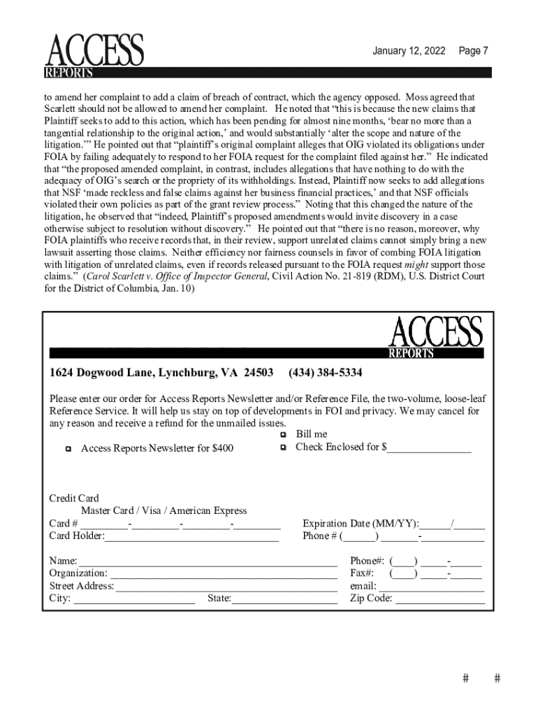 Volume 48, Number 1 January 12, 2022A Journal of News & Developments, Opinion & Analysis In this Issue Court Rules Consultant Corollary Applies to Records From Congress ................... 1 Views