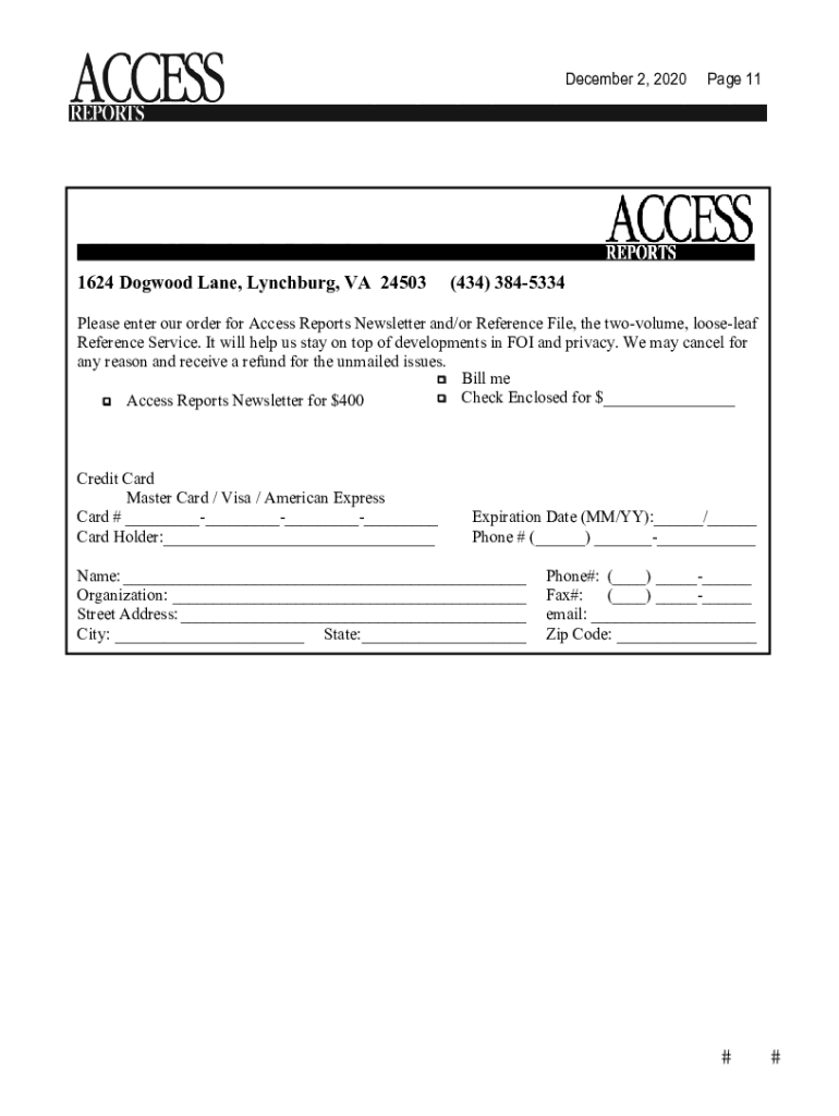 Volume 46, Number 23 December 2, 2020A Journal of News & Developments, Opinion & AnalysisCourt Rules Correlated Data Protected by Exemptions 3 and 6 ........... 1 Views from the States ...........................