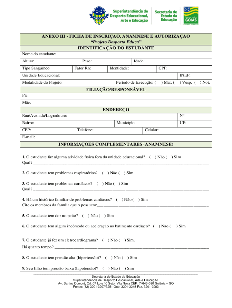 Obtenha o gratuito ANEXO III - FICHA DE INSCRIO, ANAMNESE E AUTORIZAO ...