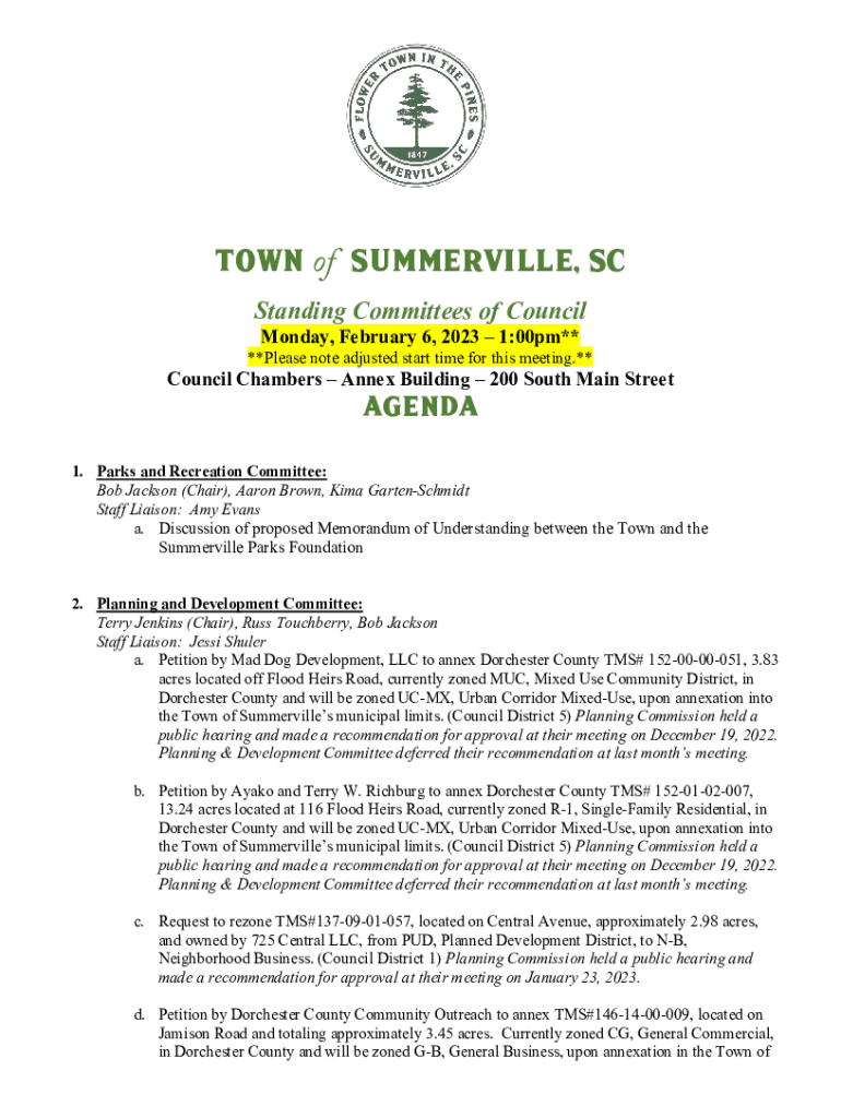 Town of Summerville, SC Standing Committees of Council Monday, February 6, 2023 1:00pm****Please note adjusted start time for this meeting.**Council Chambers Annex Building 200 South Main StreetAGENDA1.