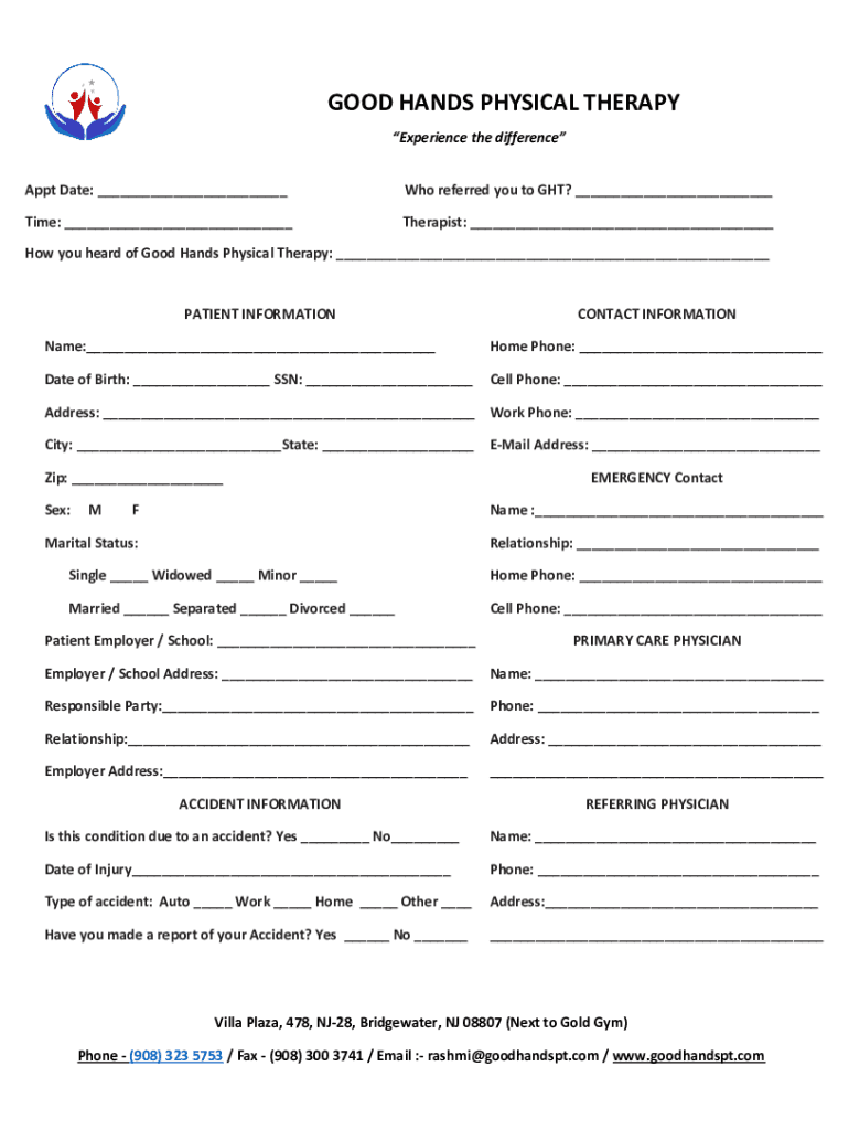 GOOD HANDS PHYSICAL THERAPY Experience the difference Apt Date: ___Who referred you to GHT? ___Time: ___Therapist: ___How you heard of Good Hands Physical Therapy: ___PATIENT INFORMATIONCONTACT Informational:___Home