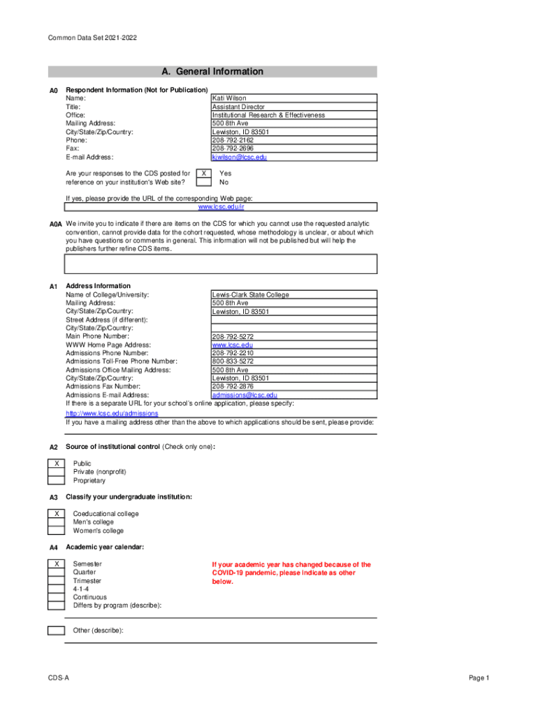 Common Data Set 20212022A. General Information A0Respondent Information (Not for Publication) Name: Title: Office: Mailing Address: City/State/Zip/Country: Phone: Fax: Email Address: Are your responses