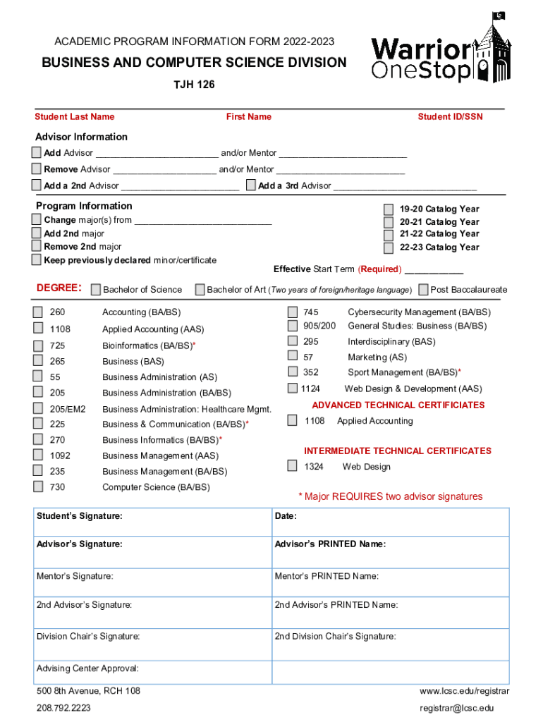 ACADEMIC PROGRAM INFORMATION FORM 20222023BUSINESS AND COMPUTER SCIENCE DIVISION AJH 126 Student Last NameFirst NameStudent ID/Advisor Information Add Advisor ___ and/or Mentor ___ Remove Advisor