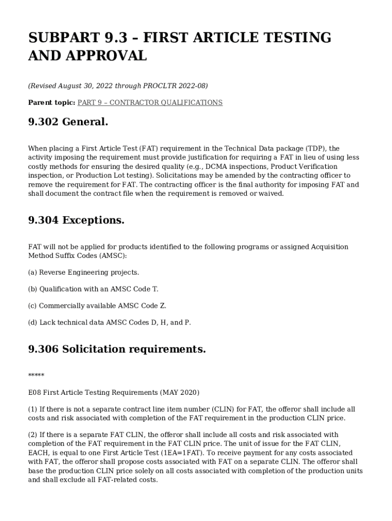 SUBPART 9.3 FIRST ARTICLE TESTING AND APPROVAL (Revised August 30, 2022, through PROCTOR 202208) Parent topic: PART 9 CONTRACTOR QUALIFICATIONS9.302 General. When placing a First Article Test (FAT)