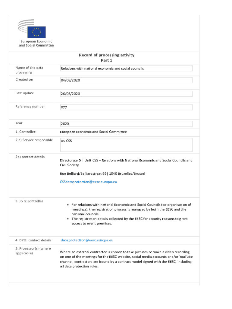 Record of processing ac city Part 1 Name of the data processingRela ONS with Na oral economic and social councilsCreated on04/08/2020Last update26/08/2020 Reference number077 Year20201. Controller:European