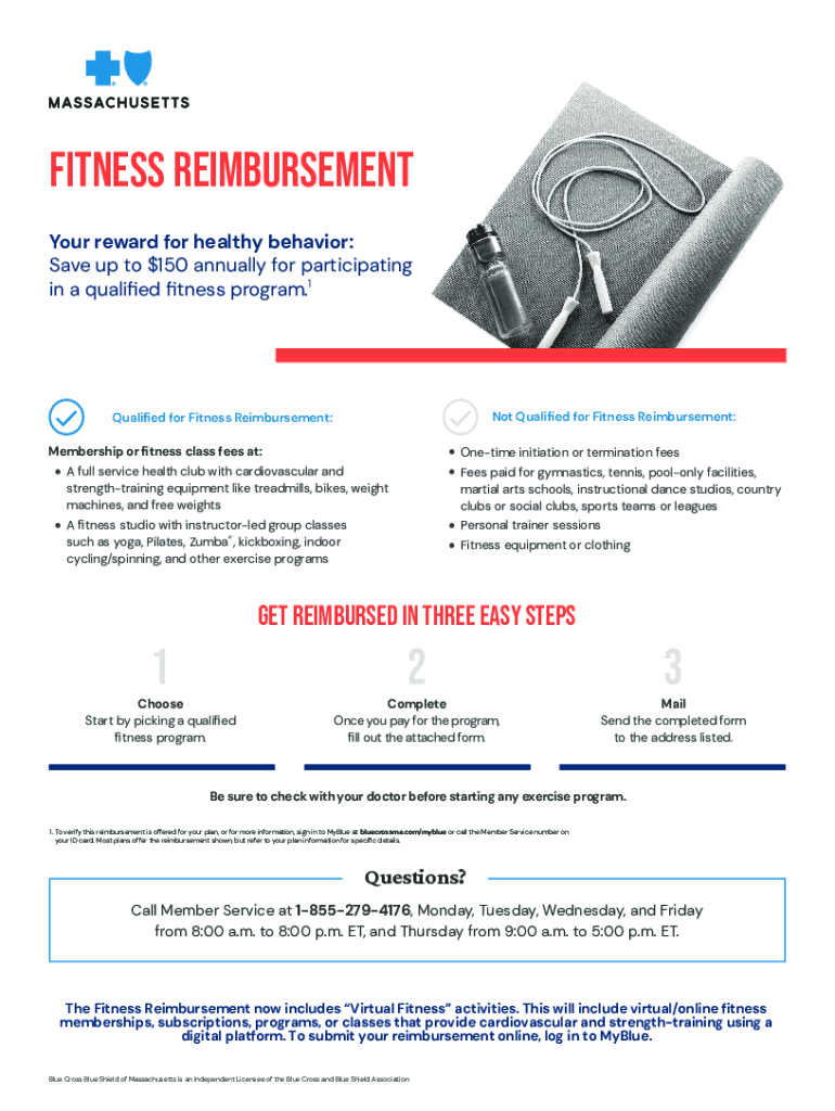 Fitness Reimbursement Your reward for healthy behavior: Save up to $150 annually for participating in a qualified fitness program.1Qualified for Fitness Reimbursement: Onetime initiation or termination
