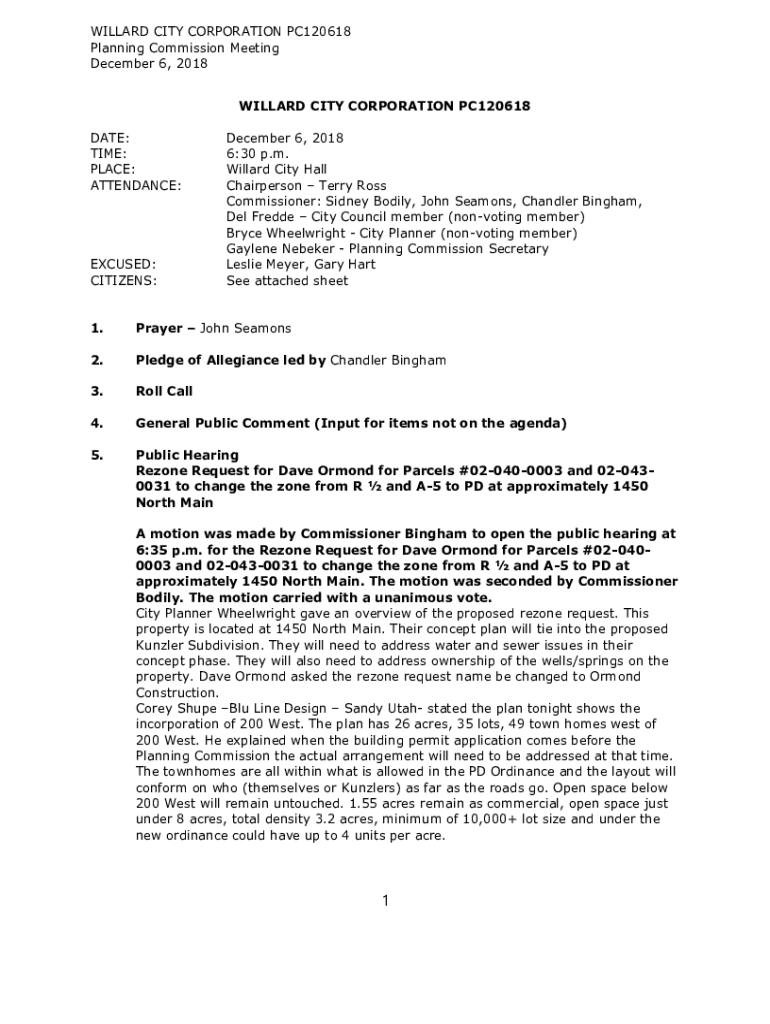 WILLARD CITY CORPORATION PC120618 Planning Commission Meeting December 6, 2018, WILLARD CITY CORPORATION PC120618 DATE: TIME: PLACE: ATTENDANCE:EXCUSED: CITIZENS:December 6, 2018 6:30 p.m. Willard