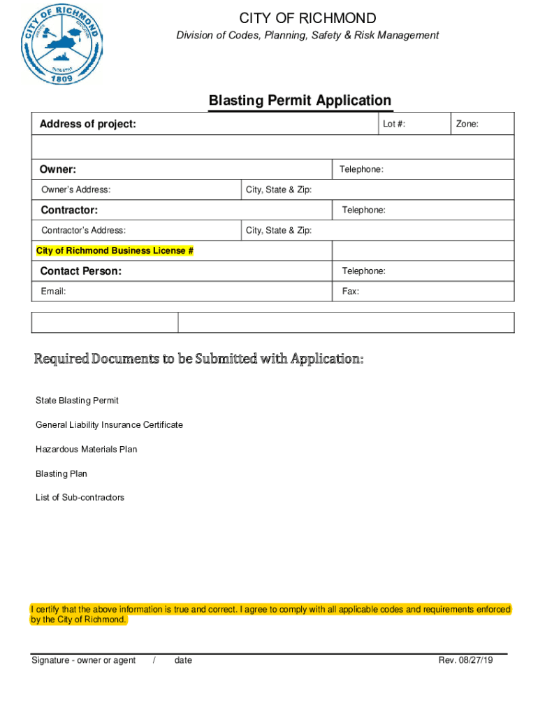 CITY OF RICHMOND Division of Codes, Planning, Safety & Risk ManagementBlasting Permit Application Address of project:Lot #:Owner:Zone:Telephone:Owners Address:City, State & Zip:Contractor:Telephone:Contractors