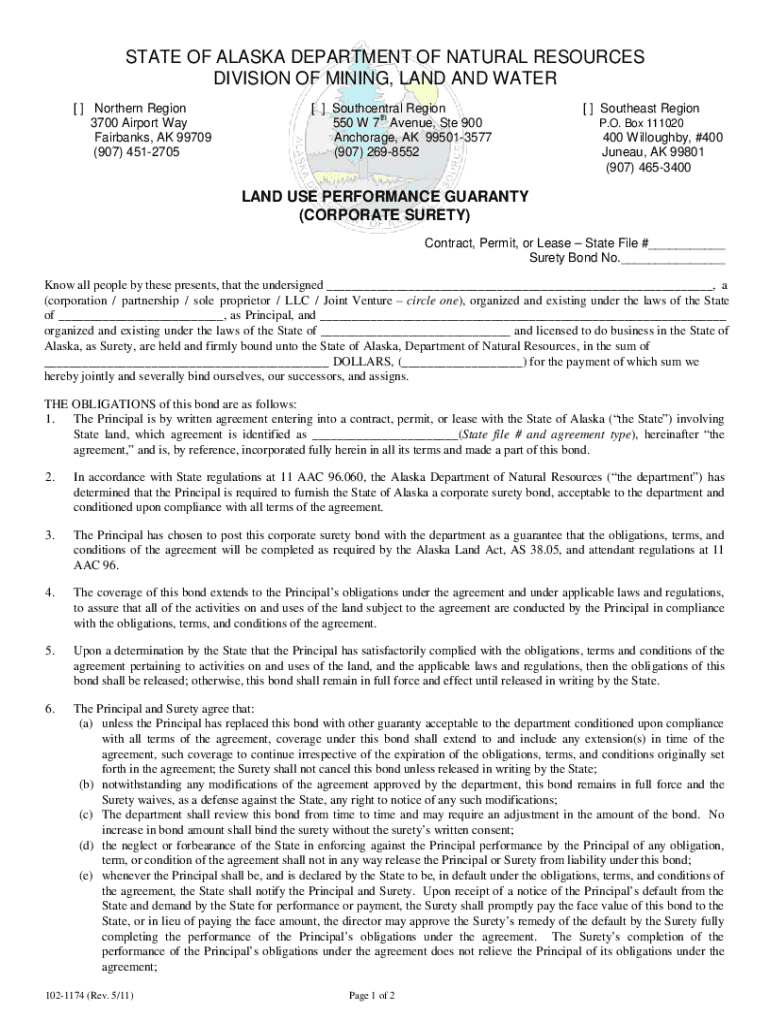 INSTRUCTIONS PERFORMANCE GUARANTY LAND USE BOND (Corporate Surety) 1. The performance guaranty requirement of 11 AAC 96.060(a)(1)(B) may be satisfied by the posting of a Surety Bond. The Surety on