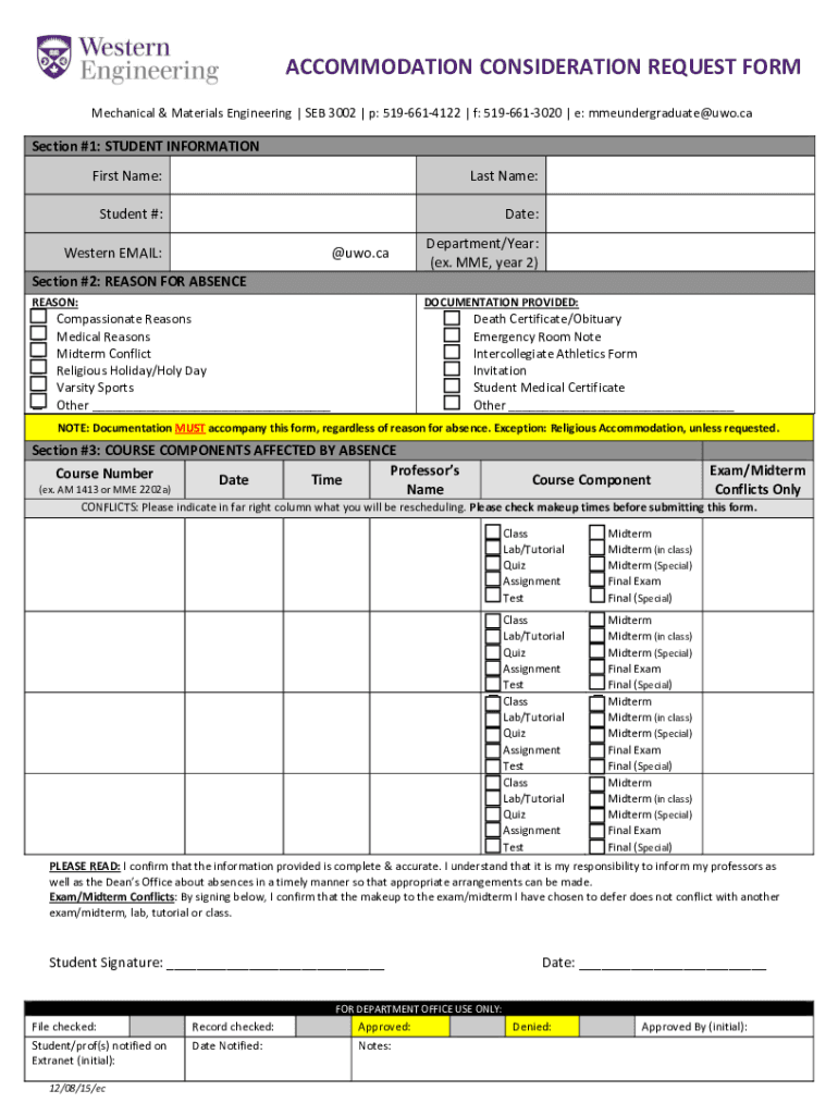 ACCOMMODATION CONSIDERATION REQUEST FORM Mechanical & Materials Engineering | SEB 3002 | p: 5196614122 | f: 5196613020 | e: mmeundergraduate@uwo.caSection #1: STUDENT INFORMATION First Name:Last Name:Student