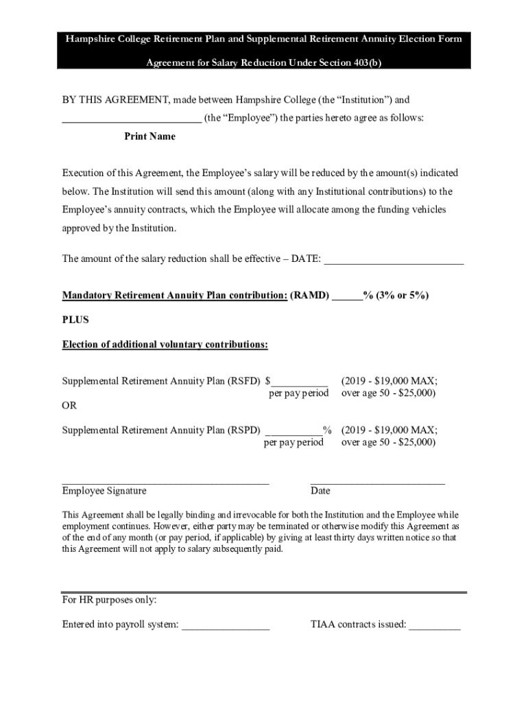 Hampshire College Retirement Plan and Supplemental Retirement Annuity Election Form Agreement for Salary Reduction Under Section 403(b) BY THIS AGREEMENT, made between Hampshire College (the Institution)