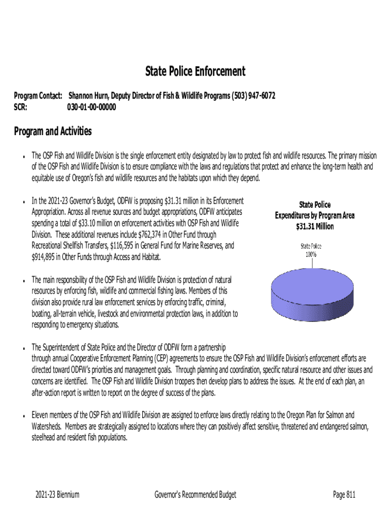 State Police Enforcement Program Contact: Shannon Turn, Deputy Director of Fish & Wildlife Programs (503) 9476072 SCR: 030010000000Program and Activities The DSP Fish and Wildlife Division is the