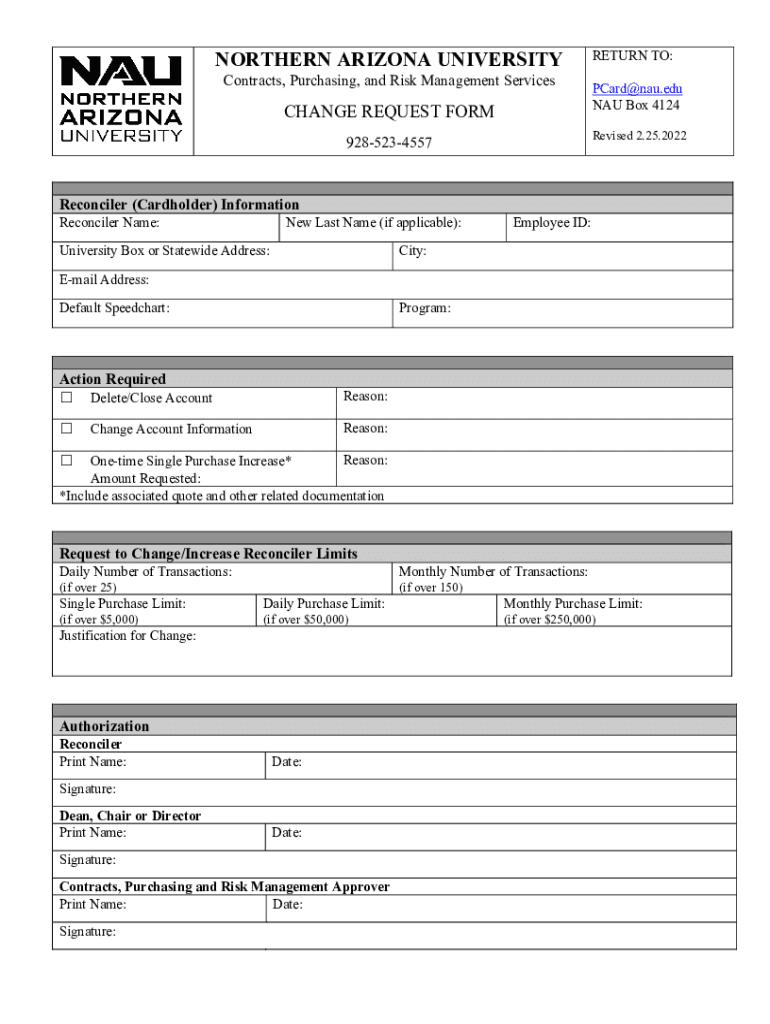 Contracts, Purchasing, and Risk Management ServicesCHANGE REQUEST FORMReconciler Name:New Last Name (if applicable):University Box or Statewide Address:Cardinal.edu