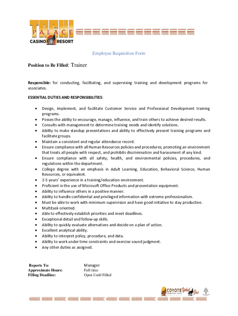Employee Requisition Form Position to Be Filled: TrainerResponsible: for conducting, facilitating, and supervising training and development programs for associates. ESSENTIAL DUTIES AND RESPONSIBILITIES: