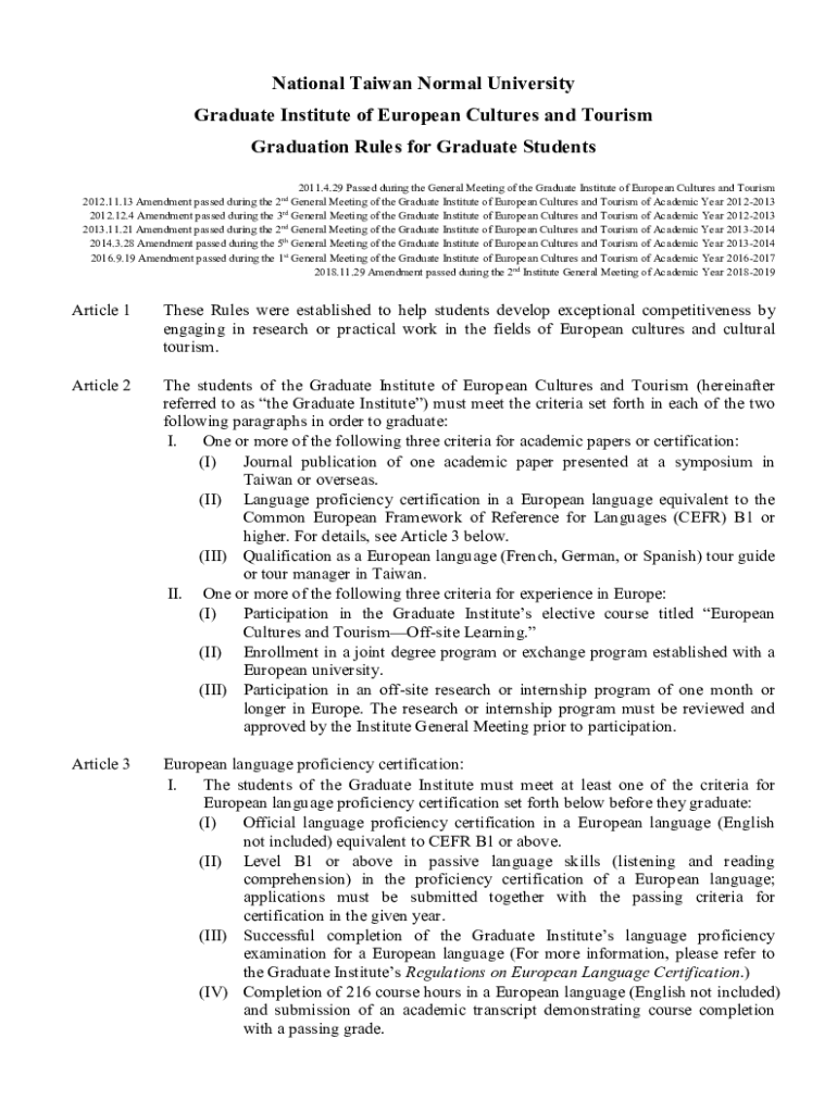 National Taiwan Normal University Graduate Institute of European Cultures and Tourism Graduation Rules for Graduate Students 2011.4.29 Passed during the General Meeting of the Graduate Institute of