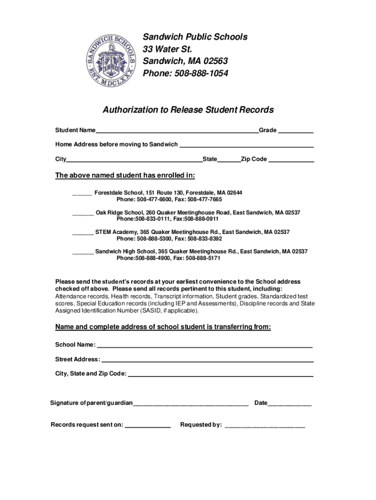Sandwich Public Schools 33 Water St. Sandwich, MA 02563 Phone: 5088881054Authorization to Release Student Records Student NameGradeHome Address before moving to Sandwich CityStateZip Goethe above