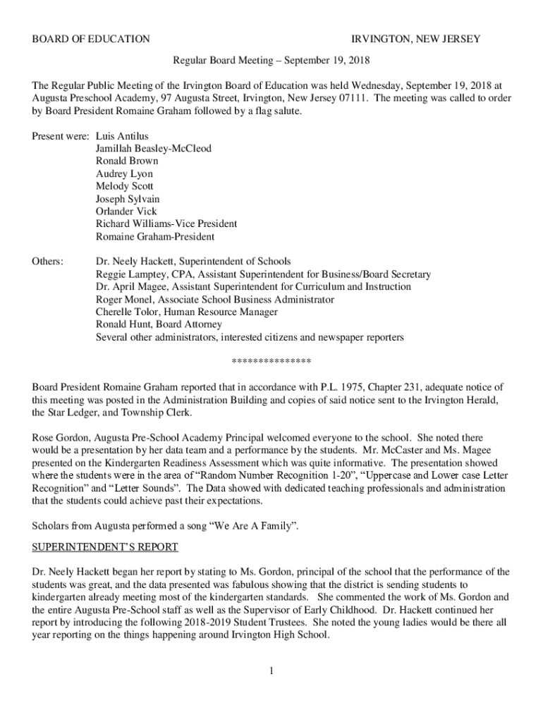 BOARD OF EDUCATIONIRVINGTON, NEW JERSEY Regular Board Meeting September 19, 2018The Regular Public Meeting of the Irvington Board of Education was held Wednesday, September 19, 2018, at Augusta Preschool
