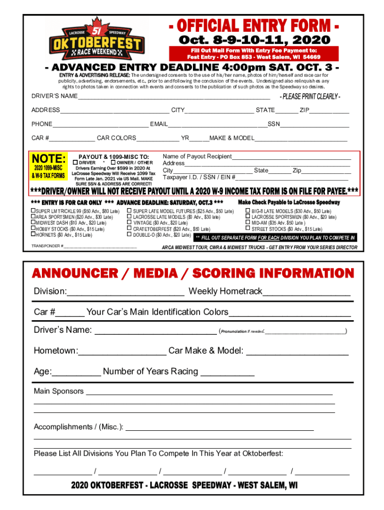 ENTRY & ADVERTISING RELEASE: The undersigned consents to the use of his/her name, photos of him/herself and race car for publicity, advertising, endorsements, etc., prior to and following the conclusion