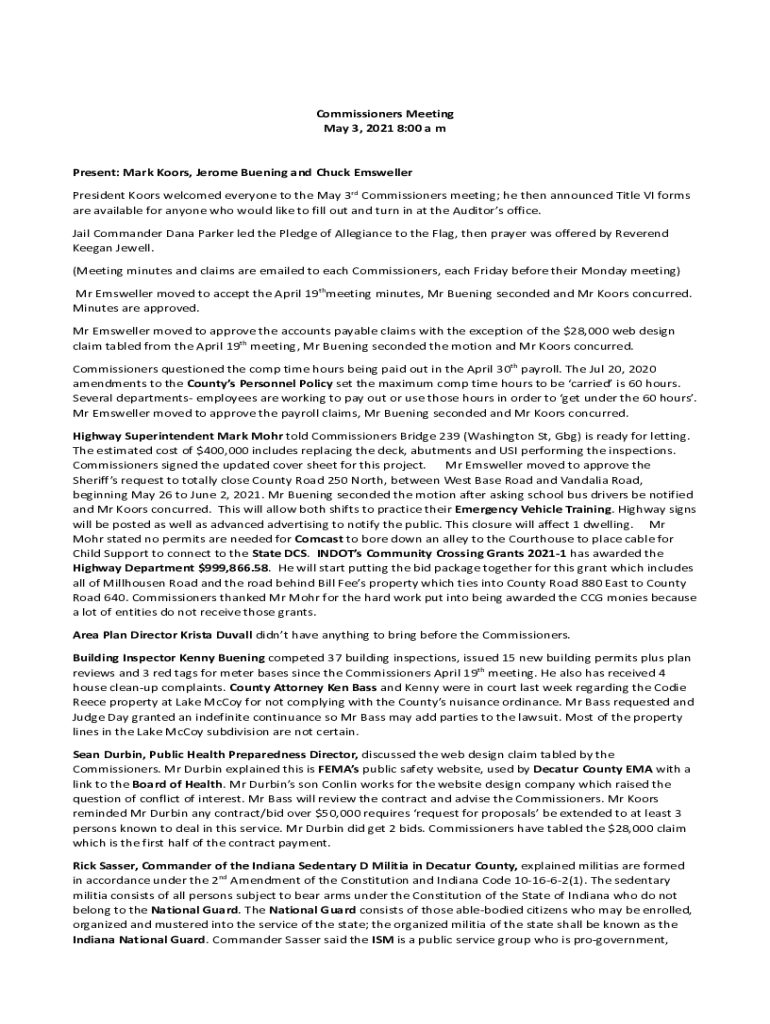 Commissioners Meeting May 3, 2021 8:00 a present: Mark Doors, Jerome Burning and Chuck Em sweller President Doors welcomed everyone to the May 3rd Commissioners meeting; he then announced Title VI