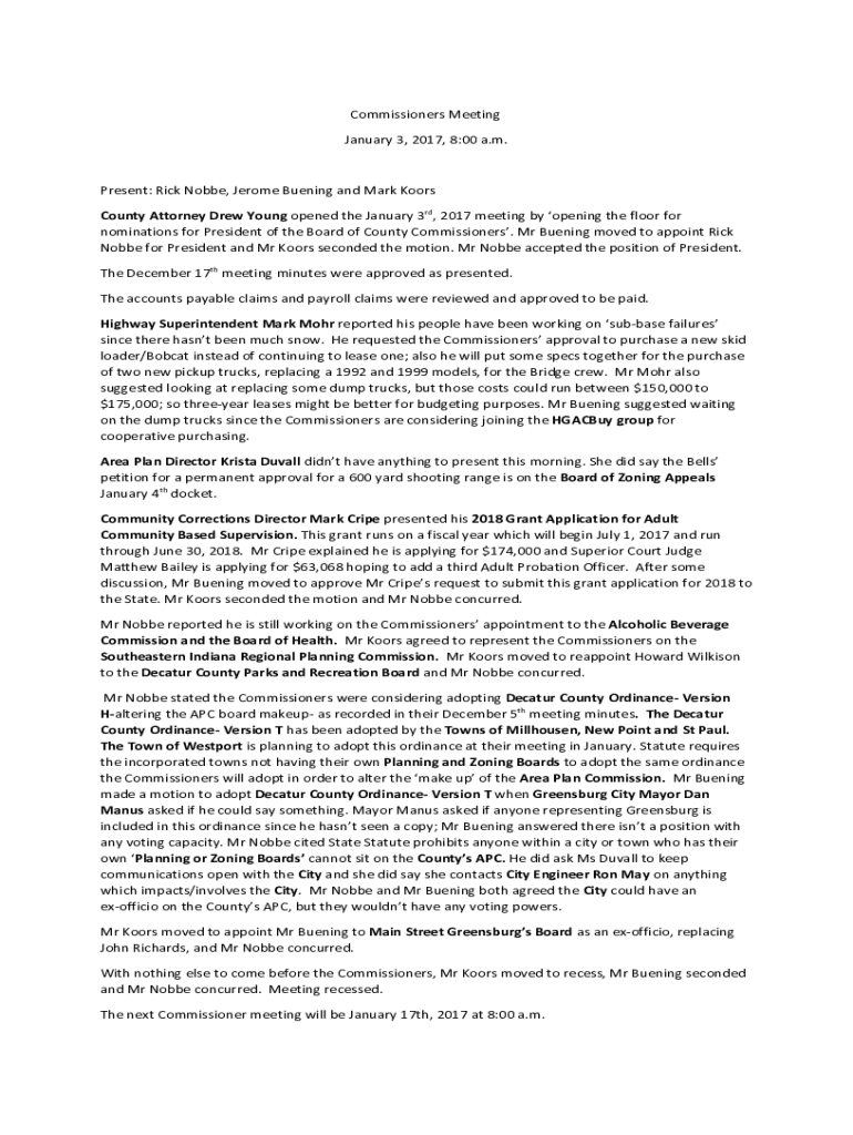 Commissioners Meeting January 3, 2017, 8:00 a.m. Present: Rick Noble, Jerome Burning and Mark Doors County Attorney Drew Young opened the January 3rd, 2017 meeting by opening the floor for nominations
