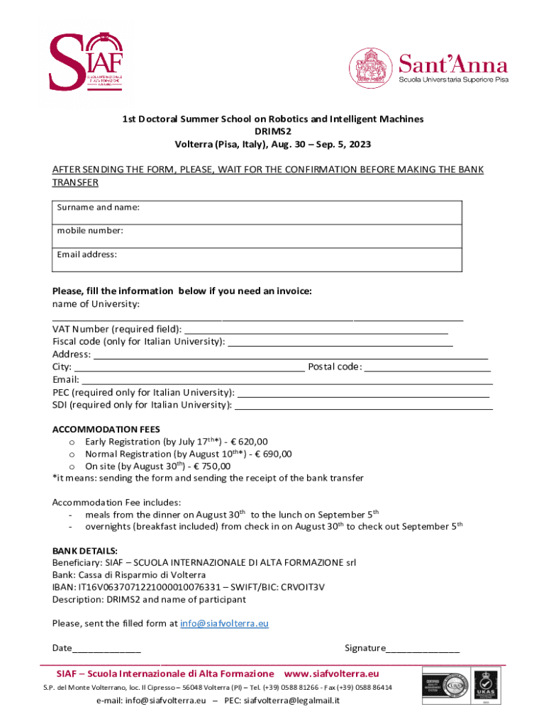 1st Doctoral Summer School on Robotics and Intelligent Machines DRIMS2 Monterrey (Pisa, Italy), Aug. 30 Sep. 5, 2023 AFTER SENDING THE FORM, PLEASE, WAIT FOR THE CONFIRMATION BEFORE MAKING THE BANK