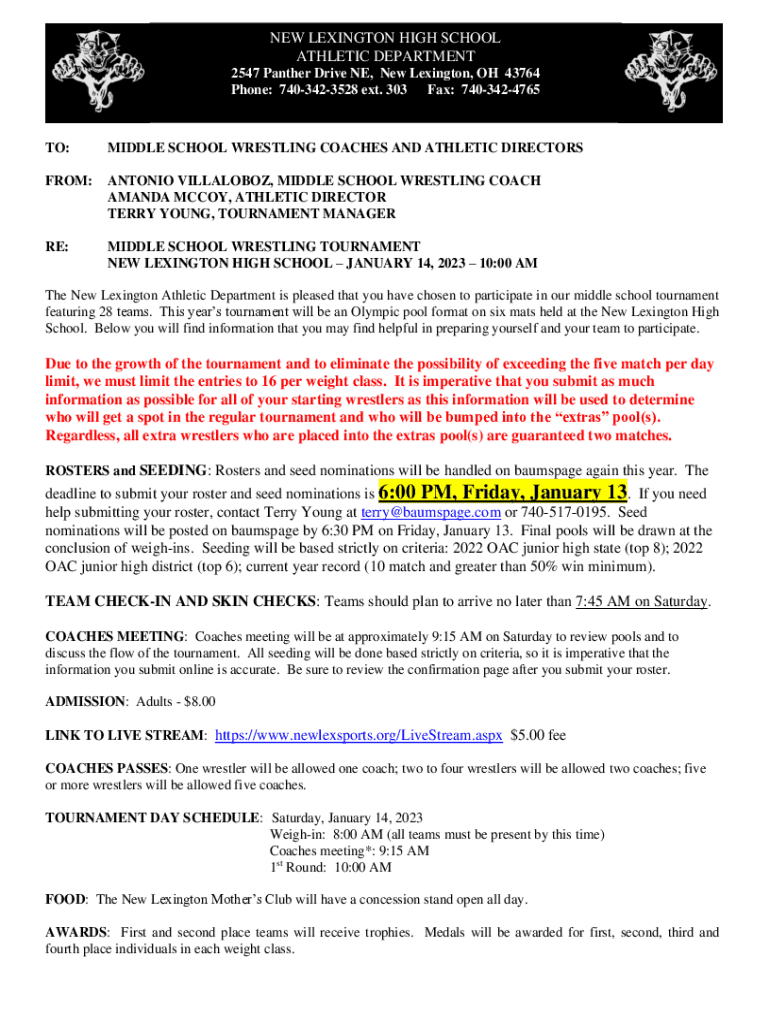 NEW LEXINGTON HIGH SCHOOL ATHLETIC DEPARTMENT 2547 Panther Drive NE, New Lexington, OH 43764 Phone: 7403423528 ext. 303 Fax: 7403424765TO:MIDDLE SCHOOL WRESTLING COACHES AND ATHLETIC DIRECTORSFROM:ANTONIO