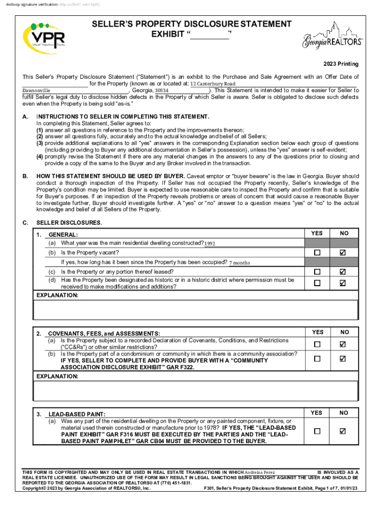 Dot loop signature verification: dtlp.us/Bx61xet3hJdQSELLERS PROPERTY DISCLOSURE STATEMENT EXHIBIT ___ 2023 Printing This Sellers Property Disclosure Statement (Statement) is an exhibit to the Purchase