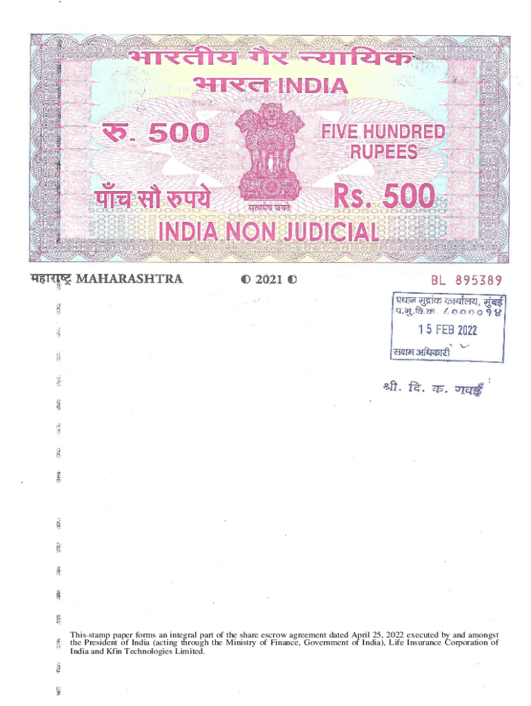 This stamp paper forms an integral part of the share escrow agreement dated April 25, 2022, executed by and amongst the President of India (acting through the Ministry of Finance, Government of India),
