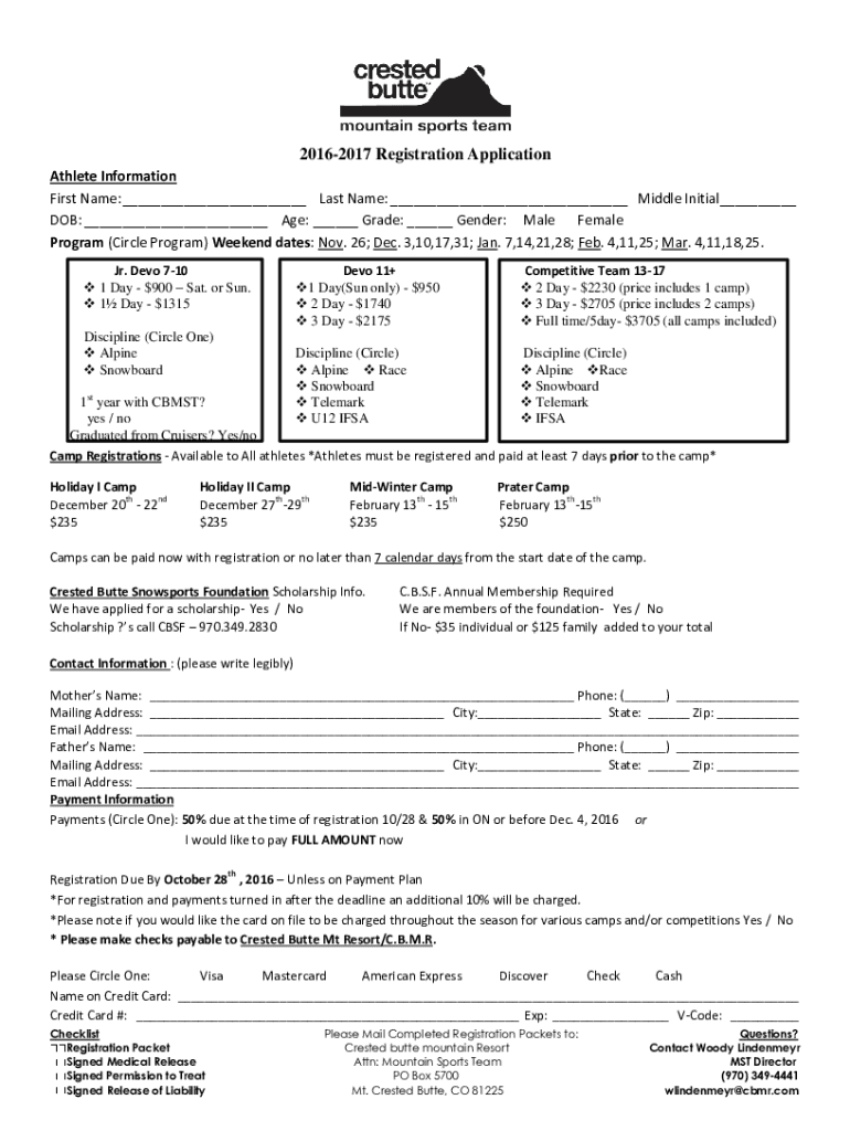 20162017 Registration Application Athlete Information First Names: ___ Last Name: ___ Middle Initial___ DOB: ___ Age: ___ Grade: ___ Gender: Male Female Program (Circle Program) Weekend dates: Nov.