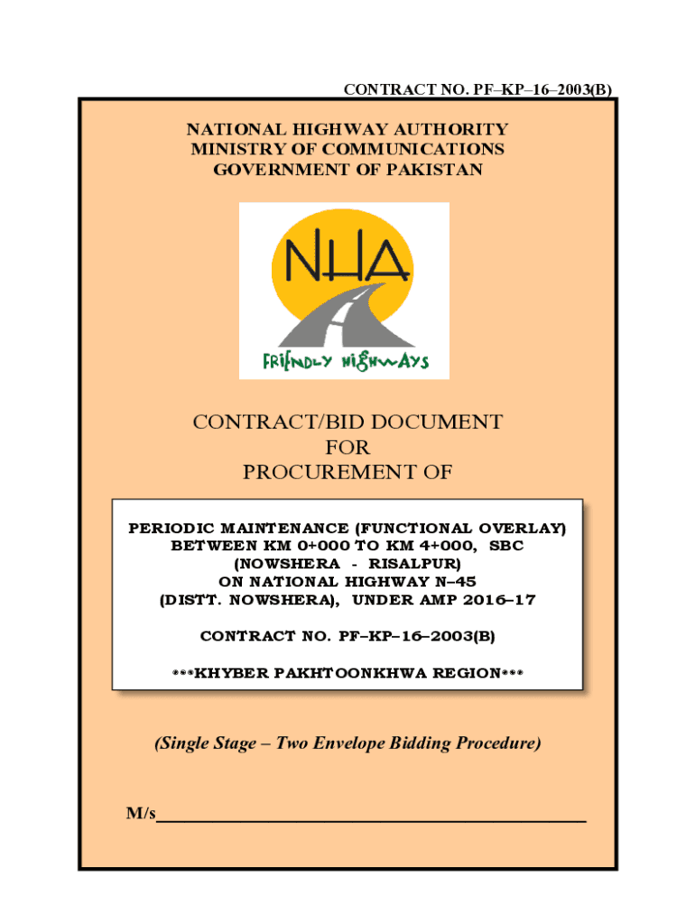 CONTRACT NO. PFKP162003(B)NATIONAL HIGHWAY AUTHORITY MINISTRY OF COMMUNICATIONS GOVERNMENT OF PAKISTANCONTRACT/BID DOCUMENT FOR PROCUREMENT OF PERIODIC MAINTENANCE (FUNCTIONAL OVERLAY) BETWEEN KM