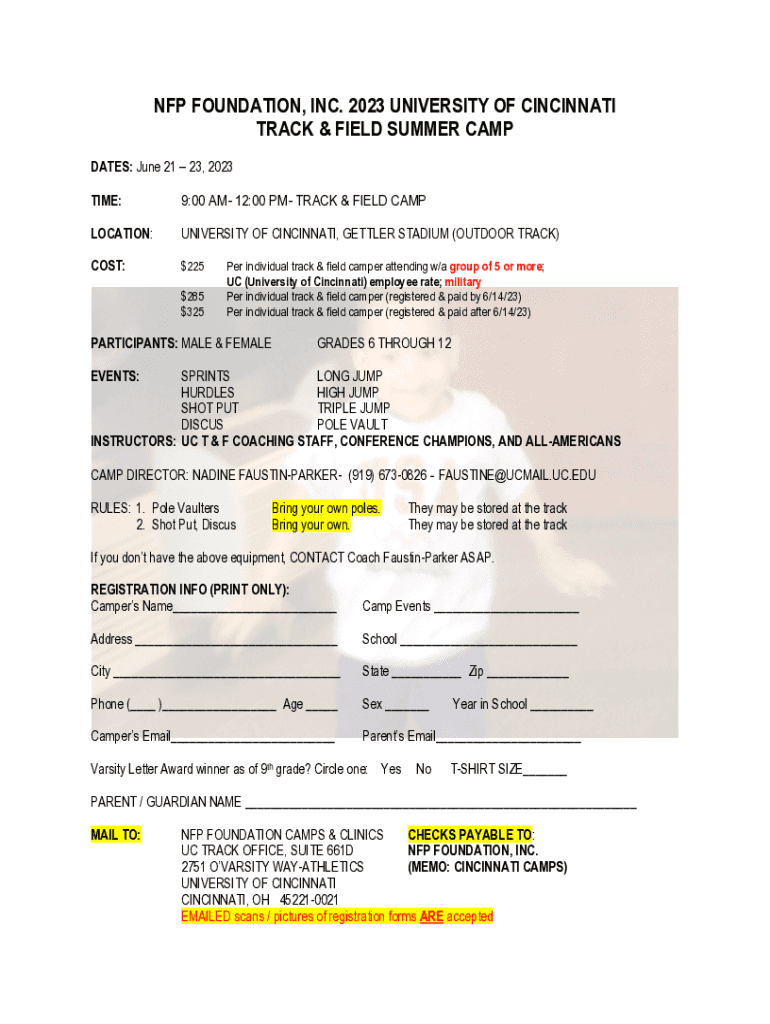 NFL FOUNDATION, INC. 2023 UNIVERSITY OF CINCINNATI TRACK & FIELD SUMMER CAMP DATES: June 21 23, 2023 TIME:9:00 AM 12:00 PM TRACK & FIELD COMPLICATION:UNIVERSITY OF CINCINNATI, SETTLER STADIUM (OUTDOOR