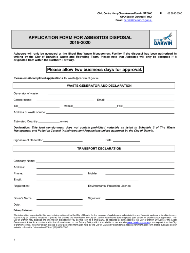 Civic Center Harry Chan Avenue Darwin NT 0800 GPO Box 84 Darwin NT 0801 Email: darwin@darwin.nt.gov.auP08 8930 0300APPLICATION FORM FOR ASBESTOS DISPOSAL 20192020 Asbestos will only be accepted at