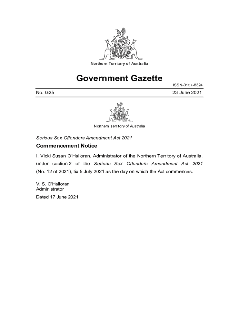 Northern Territory of AustraliaGovernment Gazette No. G25ISSN0157832423 June 2021Northern Territory of AustraliaSerious Sex Offenders Amendment Act 2021Commencement Notice I, Vicki Susan O\'Allan,