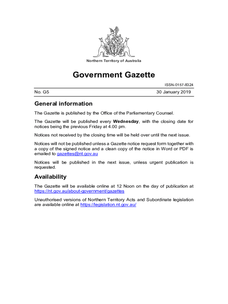 Northern Territory of AustraliaGovernment Gazette ISSN01578324No. G530 January 2019General information The Gazette is published by the Office of the Parliamentary Counsel. The Gazette will be published