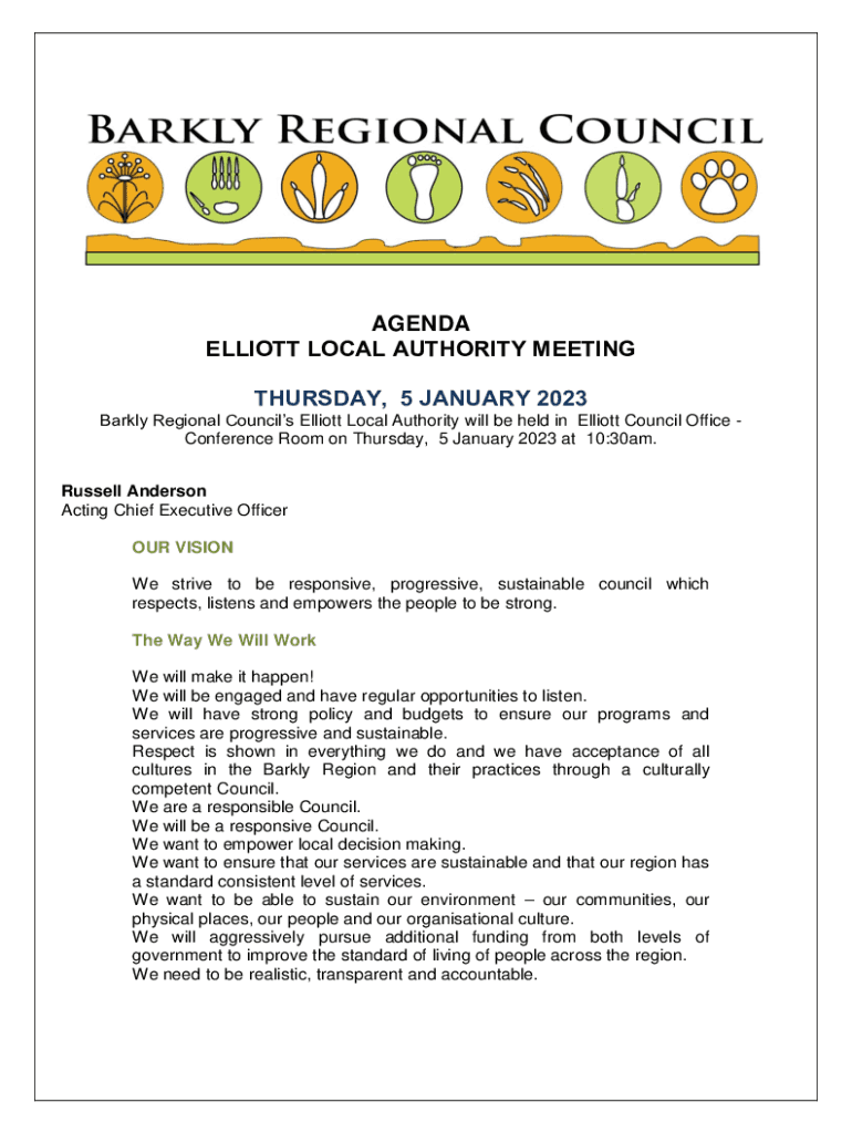 AGENDA ELLIOTT LOCAL AUTHORITY MEETING THURSDAY, 5 JANUARY 2023 Barely Regional Councils Elliott Local Authority will be held in Elliott Council Office Conference Room on Thursday, 5 January 2023