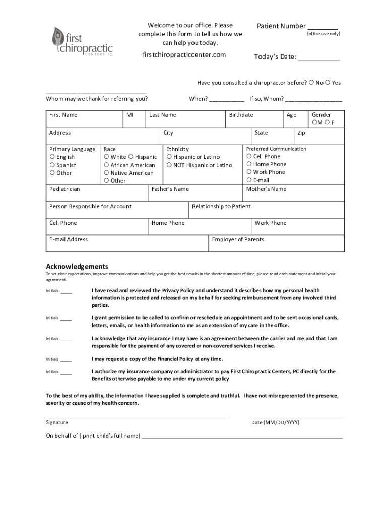 Welcome to our office. Please complete this form to tell us how pecan help you today. Patient Number ___(office use only)firstchiropracticcenter.commodes Date: ___Have you consulted a chiropractor