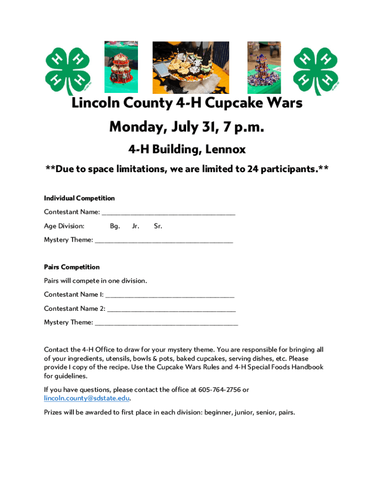 To fill out the Lincoln County 4-H Cupcake entry form, participants must provide their name, contact information, cupcake recipe, and any special decorations or themes.
