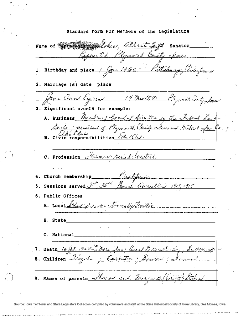 ... I\'Standard Form For Members of the Legislature Name of1. Birthday and place2. Marriage (s) date. \'\”\'?7IJ\'TFT (:;place 3. Significant events for example:A. Business4. Church membership___5.
