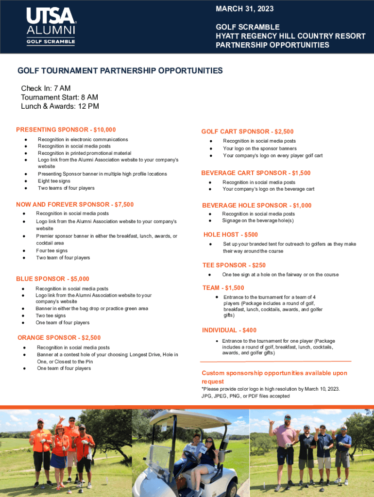 MARCH 31, 2023, GOLF SCRAMBLE HYATT REGENCY HILL COUNTRY RESORT PARTNERSHIP OPPORTUNITIESGOLF TOURNAMENT PARTNERSHIP OPPORTUNITIES Check In: 7 AM Tournament Start: 8 AM Lunch & Awards: 12 PM PRESENTING
