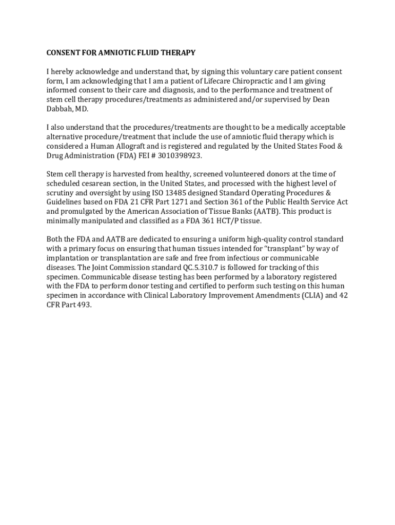 CONSENT FOR AMNIOTIC FLUID THERAPY I hereby acknowledge and understand that, by signing this voluntary care patient consent form, I am acknowledging that I am a patient of Life care Chiropractic,