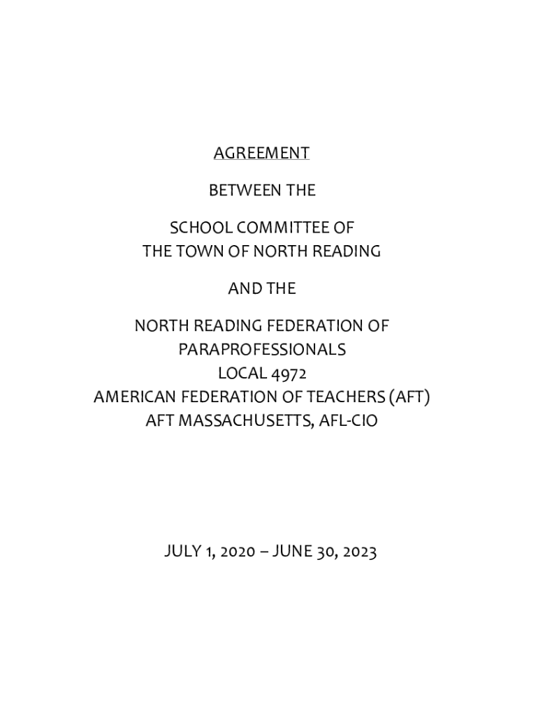 AGREEMENT BETWEEN THE SCHOOL COMMITTEE OF THE TOWN OF NORTH READING AND THE NORTH READING FEDERATION OF PARAPROFESSIONALS LOCAL 4972 AMERICAN FEDERATION OF TEACHERS (AFT) AFT MASSACHUSETTS, AFLCIOJULY