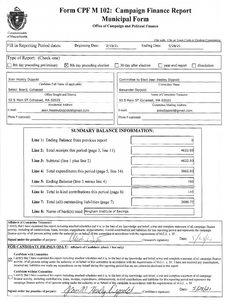 Form CPF M 102: Campaign Finance Report Municipal Form Office of Campaign and Political Finance Commonwealth of Massachusetts File with: Civil in Reporting Period dates:Beginning Date:Ending Date:2/19/21or