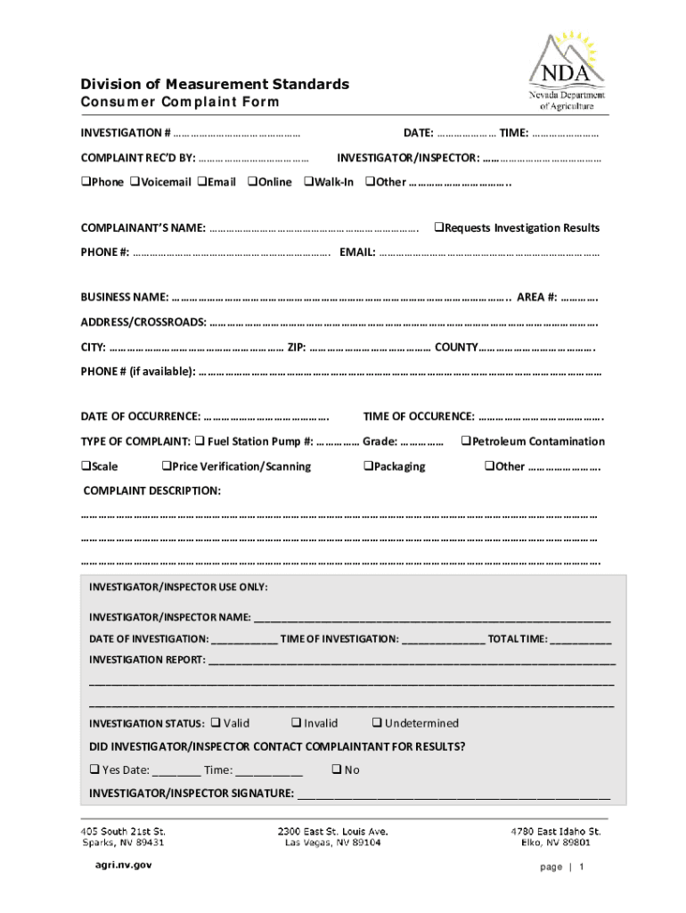 COMPLAINT RECD BY:DATE:TIME: INVESTIGATOR/INSPECTOR: PhoneVoicemailEmailOnlineWalkIn Other.COMPLAINANTS NAME: